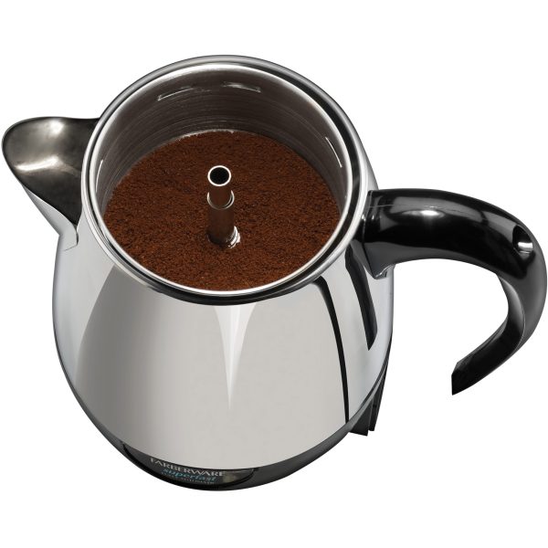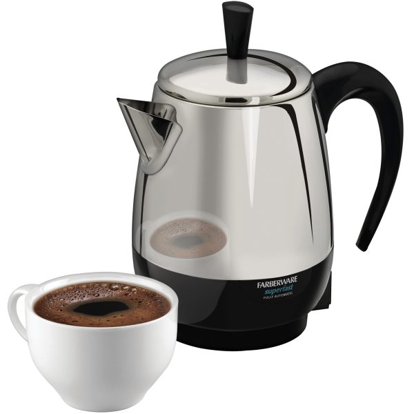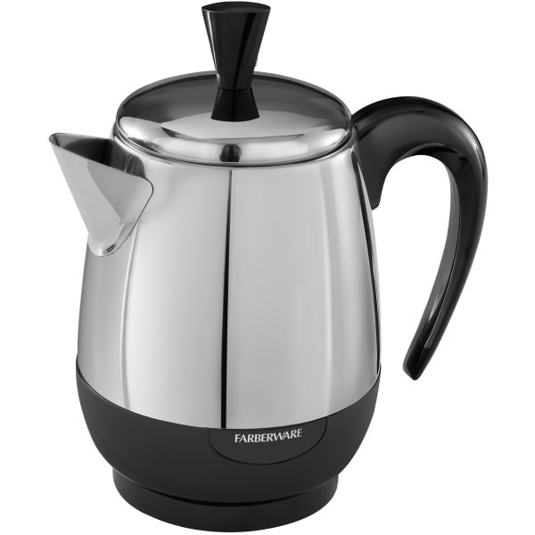 Rediscover the robust aroma and taste of percolated coffee with the FARBERWARE® 2-4 Cup* Stainless Steel Electric Percolator. This premium unit produces about one cup per minute, so there’s no waiting around for delicious coffee. The automatic “keep warm” function gently warms coffee after perking, and the detachable cord makes for easy pouring and storage.